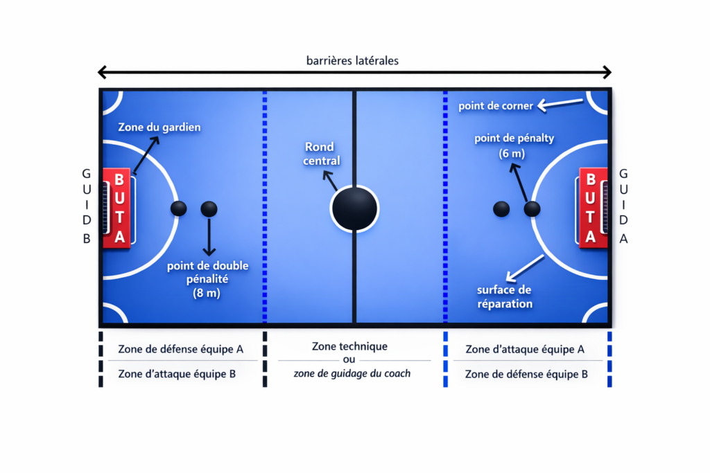 - Deux équipes de 5 joueurs : 4 joueurs de champ déficients visuels + 1 gardien voyant.